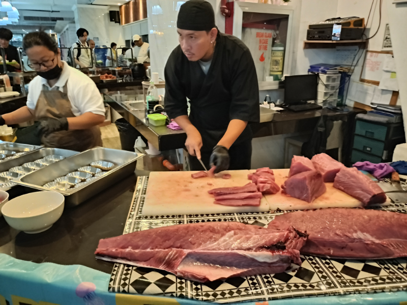 校舎へ戻るとマグロ解体ショーが